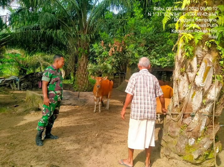 TANAHPUTIH ,Bandamuaonline.com —- Demi mencegah Penyakit Mulut dan Kuku ( PMK) diwilayah binaan, Kembali Babinsa Koramil 0321-02/ TP Serda M Efendi Nasution bersama masyarakat peternak Sapi bapa Juki melaksanakan Kegiatan Pengecekan Penyakit Mulut dan KuKu (PMK) Pada Ternak Sapi miliknya warga Kepenghuluan Menggala Sempurna Kecamatan Tanah Putih, Kabupaten Rohil Kamis (8/1/2026)