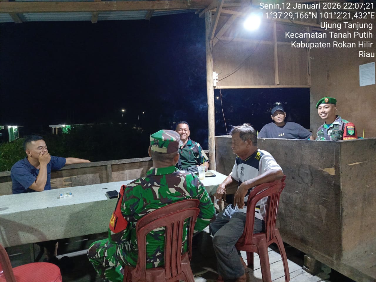 Dua anggota Koramil yang dipimpin Sertu Ruswadi bersama Ketua RT dan Ketua RW 01 beserta masyarakat melaksanakan Patroli/Siskamling dalam rangka penguatan Binter untuk mengaktifkan kembali pelaksanaan Kegiatan Siskamling di wilayah Kepenghuluan Ujung Tanjung Kecamatan Tanah Putih Kabupaten Rokan Hilir Pada Senin Malam (12/1/2026)