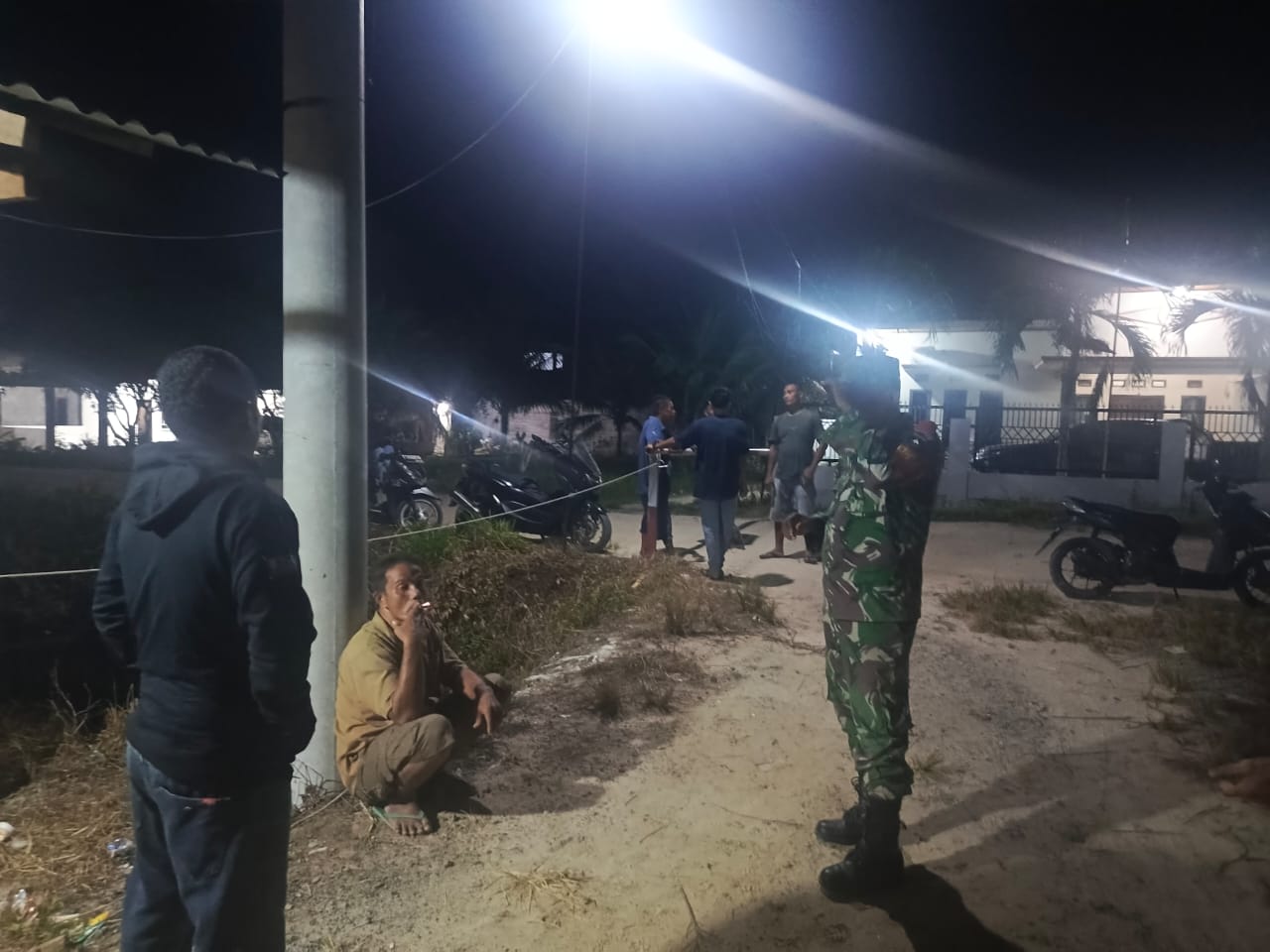 Sertu Suparman bersama masyarakat melaksanakan Patroli/Siskamling dalam rangka penguatan Binter untuk mengaktifkan kembali pelaksanaan Kegiatan Siskamling diwilayah Kelurahan Cempedak Rahuk Kecamatan Tanah Putih. Kabupaten Rokan Hilir pada Minggu Malam (16/11/2025).