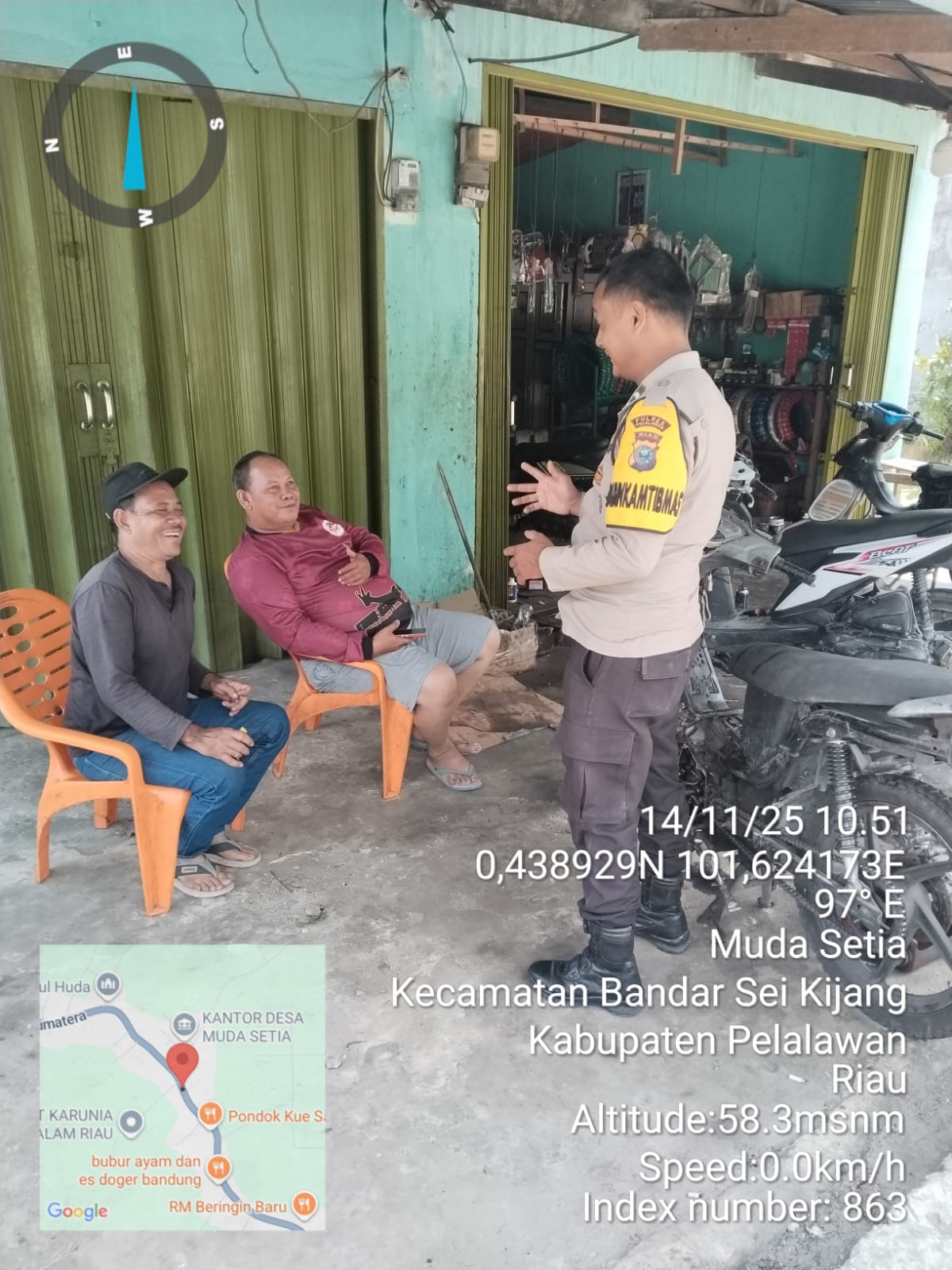 PELALAWAN ,Bandamuaonline.com – Bhabinkamtibmas Desa Muda Setia melaksanakan kegiatan silaturahmi dalam rangka meningkatkan cooling system dan harkamtibmas di Desa Muda Setia. Kegiatan ini berlangsung pada hari Jumat, 14 November 2025, sekira pukul 10.40 WIB.