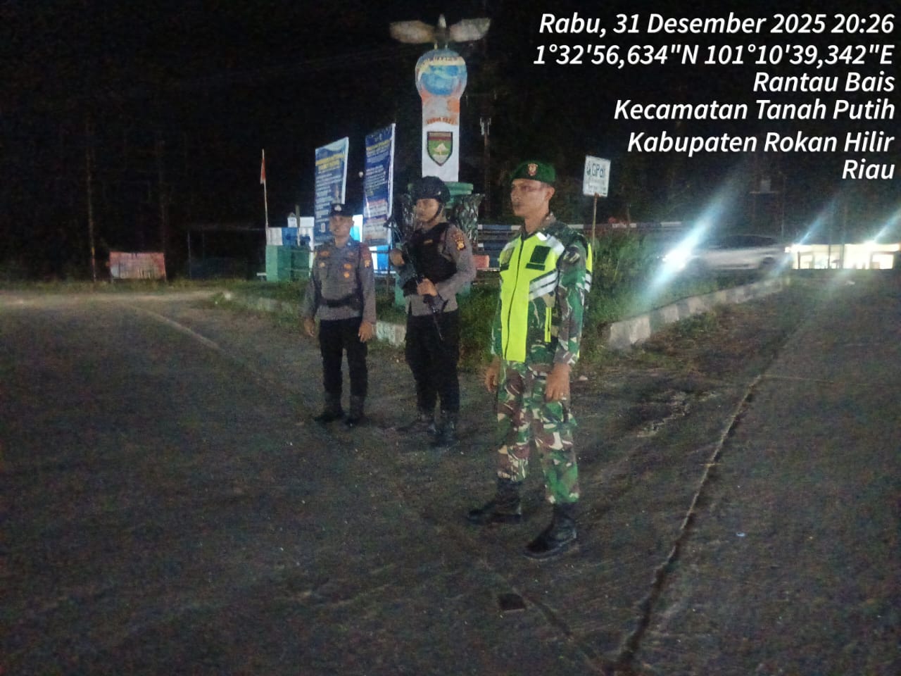 Serma Arsyad melaksanakan PAM Natal dan Tahun Baru ( Nataru) diwilayah Koramil 02/TP tepatnya Pos Pam Nataru Perbatasan Jalan Lintas Riau – Sumut Kepenghuluan Rantau Bais Kecamatan Tanah Putih Kabupaten Rokanhilir Rabu Malam (31/12/2025)